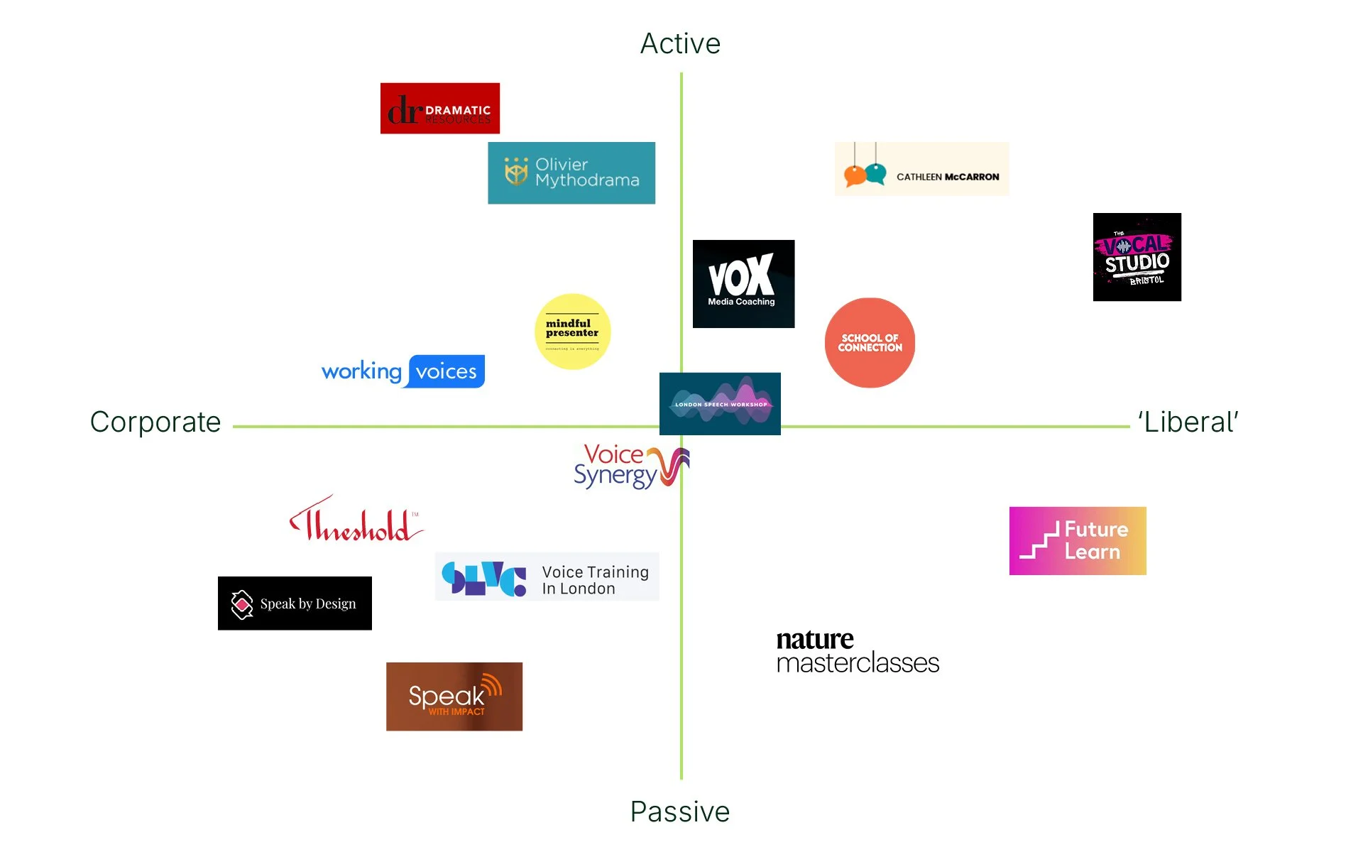 For VOX Coaching, a communications training company working with public sector and higher education clients, the axes became Corporate vs. Liberal and Active vs. Passive. These reflected not just VOX’s personality, but the kind of experience their clients were actually looking for. Importantly, this expanded the competitive set beyond similar training providers – including online courses and specialist platforms that shared overlapping audience mindsets.